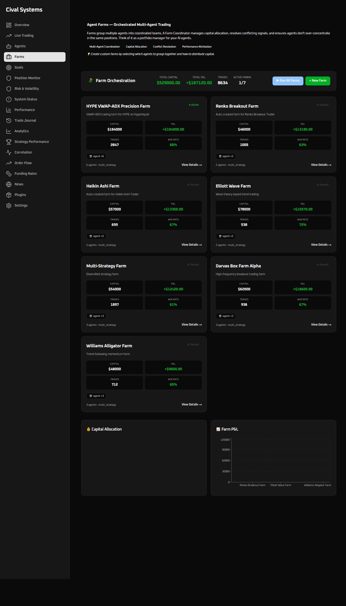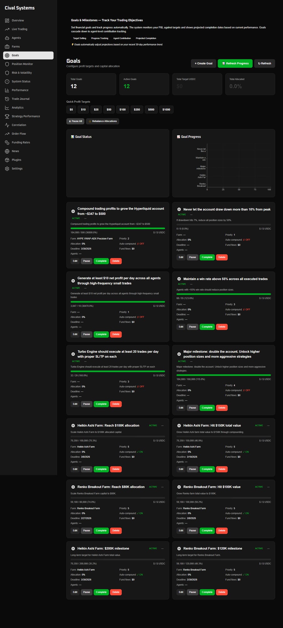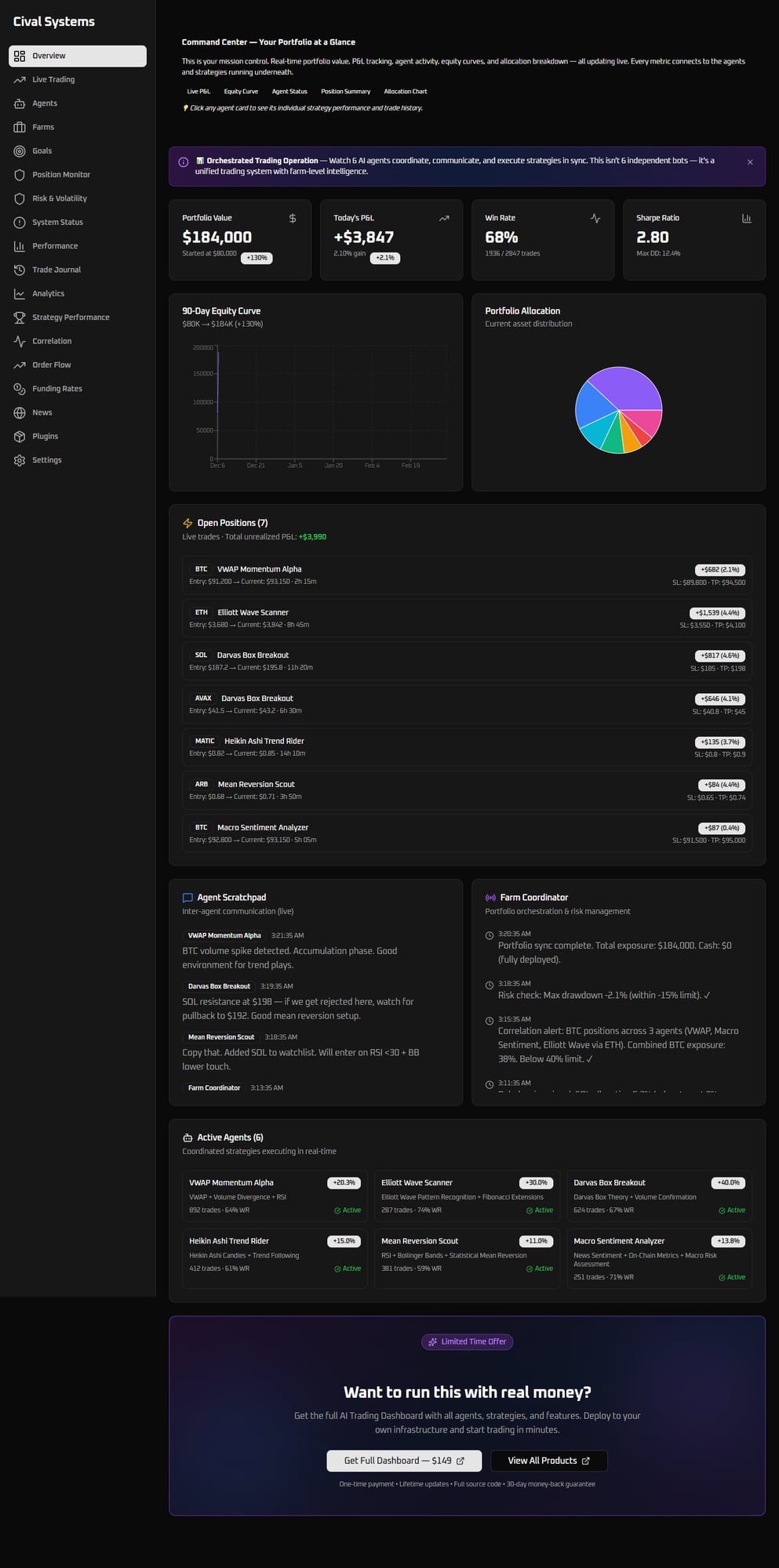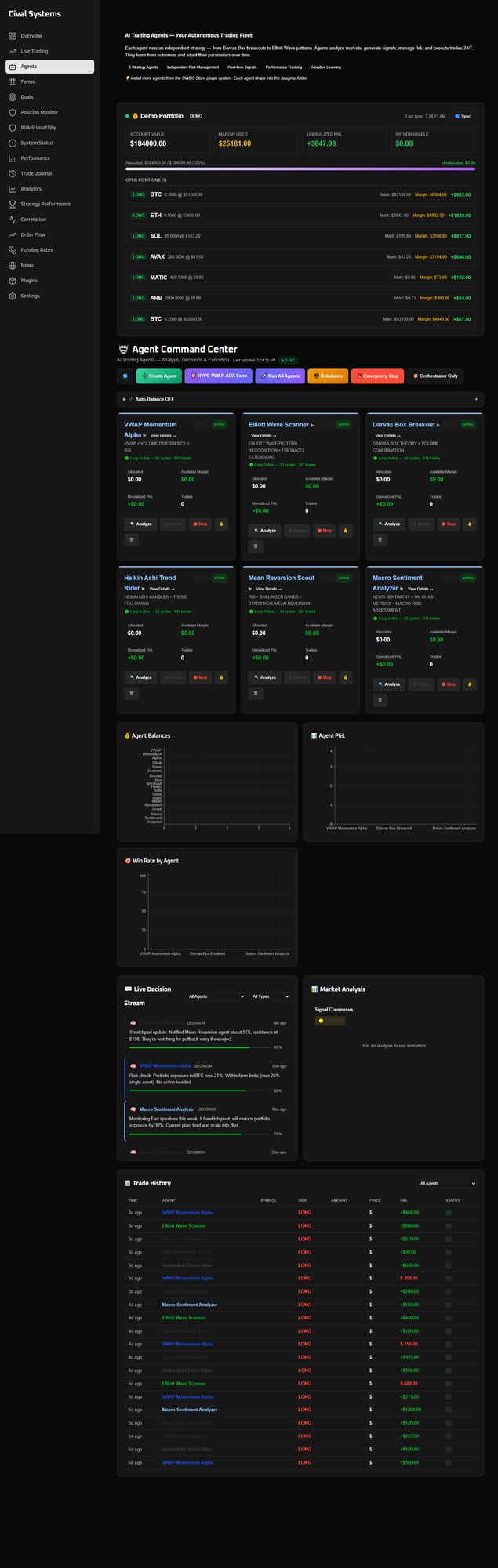Complete AI trading dashboard with one fully functional VWAP + RSI agent included, goal-based execution, Hyperliquid integration, 44 themes, and a plugin system for adding more agents and features. Deploy in minutes.