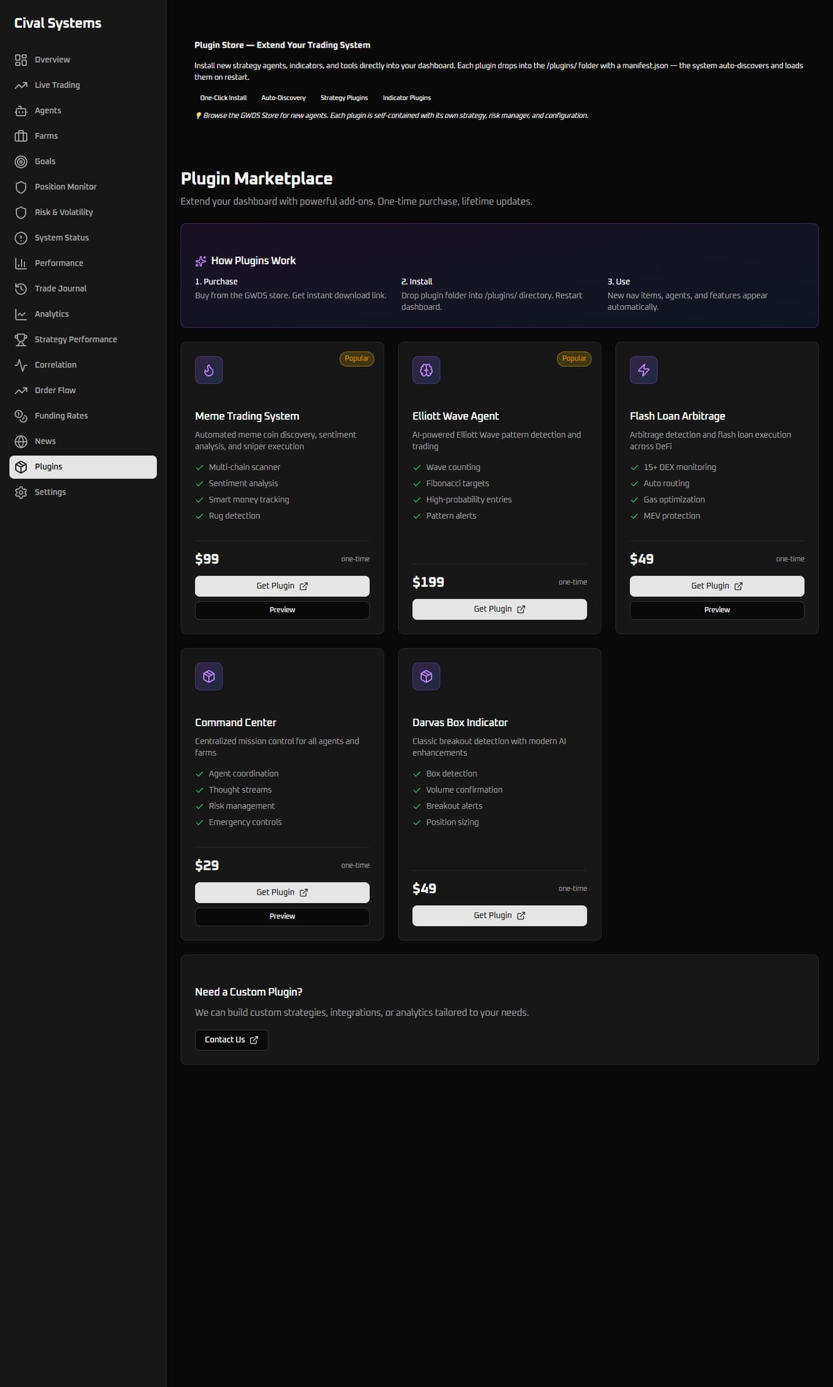 Want more strategies? Add premium agents (Darvas Box, Elliott Wave, Heikin Ashi, Mean Reversion, Macro Sentiment) from our store. Each one plugs directly into the dashboard.